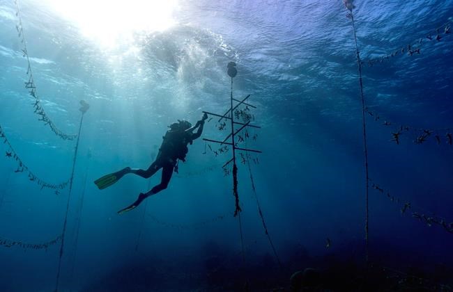 He steers the boat to an unmarked spot that he knows as the “coral nursery.” ”It’s like a forest under the sea,” he says, strapping on blue flippers and fastening his tank before tipping backward into the azure waters. He swims down 25 feet (7.6 metres) carrying a pair of metal shears, fishing line and a plastic crate.