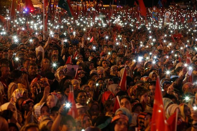 Erdogan, who won re-election last month and sworn into office July 9 under a new executive government system that concentrates power in the president’s hands, addressed tens of thousands of people gathered Sunday night on an Istanbul bridge that was renamed as the July 15 Martyrs’ Bridge.