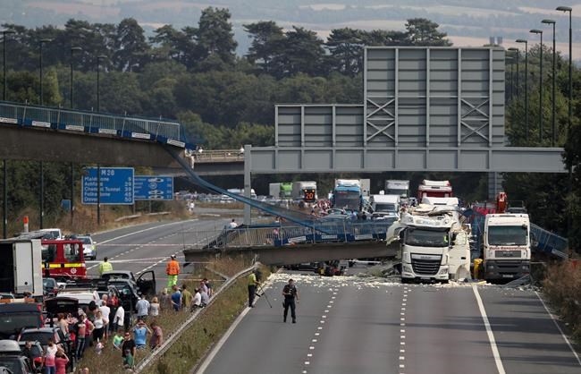 The M20 highway running southeast of London had been closed for 30 hours since midday Saturday, when a westbound truck struck and partly destroyed a pedestrian bridge. A motorcyclist fell off his bike and was hospitalized with broken ribs, while the trucker was treated for shock.
