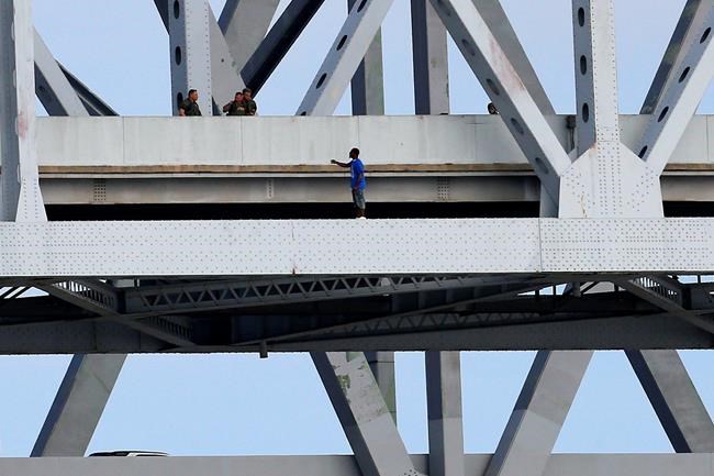Police pulled the rope back up late Friday afternoon, and the man lay down on a girder below the bridge and outside its railing.