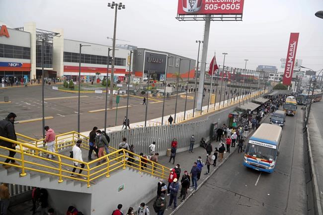 More than 2,000 waited Tuesday afternoon in lines that snaked from the main entrance of the mall. Almost all wore masks, but many did not respect the 3-foot (1-meter) distancing mandated by the Peruvian government — already less than the 6 feet advised elsewhere. Street vendors, taxi drivers and beggars wandered among the crowds.