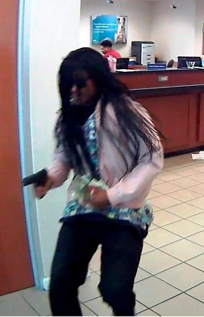 Police say the robber wore sunglasses, a pink jacket and a wig with long dreadlocks. Police released surveillance photos showing the suspect holding a gun and a wad of cash as he left the SunTrust branch.