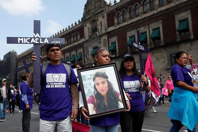 Dia de Muertos is observed Nov. 1-2, and the demonstration was billed as a “Dia de Muertas” march, or “Day of the Dead Women,” to call attention to the killings of women and girls — nine per day in the country on average, according to the United Nations. It was the second Dec. 3 march by the organization, Voices of Absence, which is out to get the date associated with their cause.