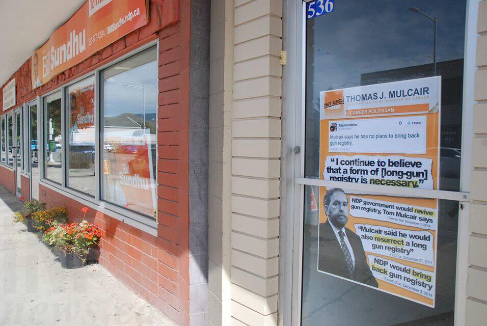KAMLOOPS – A local business is showing its disapproval with the federal New Democratic Party by placing anti-party signs in its store front windows. The business in question is located right next door to Kamloops-Thompson-Cariboo NDP candidate Bill Sundhu’s headquarters on Tranquille Drive.