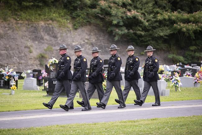 Dozens of uniformed law enforcement officers gathered Tuesday at the funeral at Prestonsburg’s Mountain Arts Center. Petry’s family gave permission for media to livestream the event on local news stations. Frasure, Chaffins and the police dog, Drago, will be laid to rest after funeral services later this week.