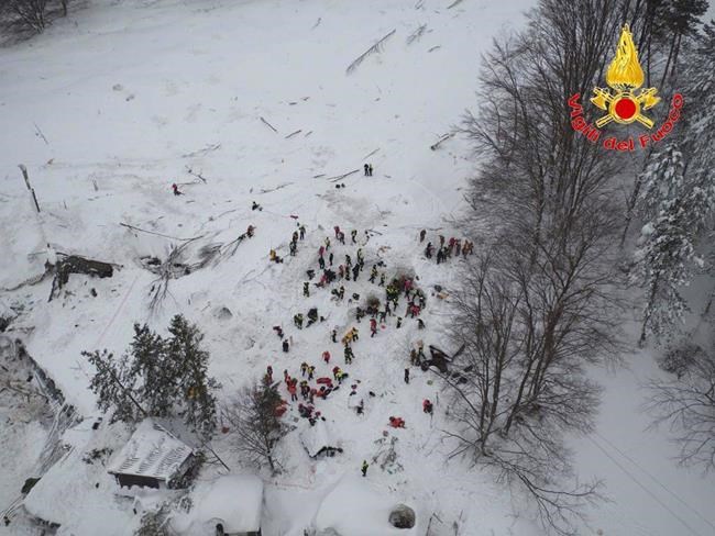 Some 30 people were believed trapped inside the hotel in the Gran Sasso mountain range when the avalanche hit after days of winter storms that dumped up to three meters (nearly 10 feet) of snow in some places. The region was also rocked by four earthquakes on Wednesday, though it was not clear if they set off the avalanche.