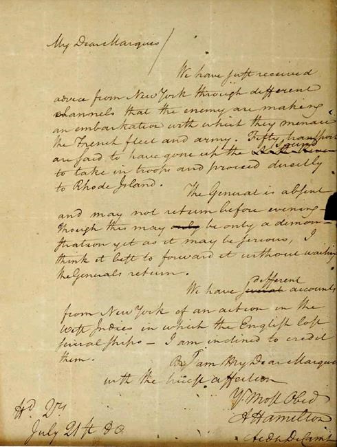 “We have just received advice from New York through different channels that the enemy are making an embarkation with which they menace the French fleet and army,” Hamilton wrote to de Lafayette while he was based in Rhode Island. “Fifty transports are said to have gone up the Sound to take in troops and proceed directly to Rhode Island.”