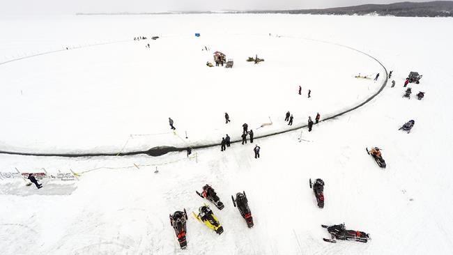 About 100 volunteers cut a circle in the ice that’s 427 feet (130 metres) in diameter, and they used four outboard boat motors to get it rotating on Saturday. It happened in Sinclair in northern Maine.