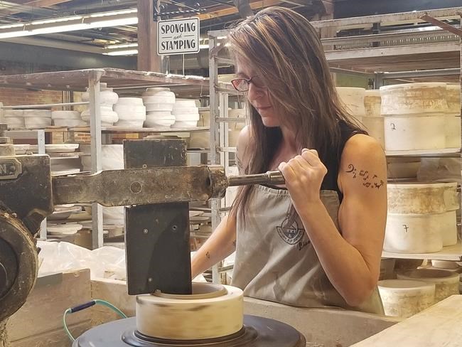 There, artist Lisa Miklash forcefully presses the lever of a jigger machine into a lump of clay.
