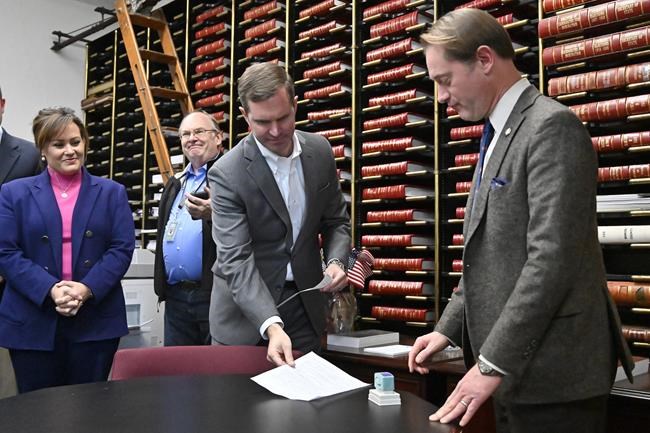 Beshear, 45, the son of former two-term Gov. Steve Beshear, was accompanied by his wife, their two children and his parents as he submitted paperwork to the secretary of state’s office for the 2023 election. Lt. Gov. Jacqueline Coleman, who will run with him again next year, also joined him.