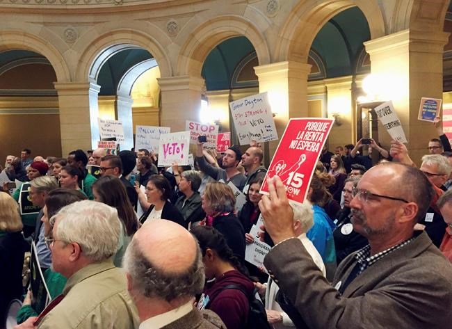Other protesters were there to call for a $15-per-hour minimum wage. A Republican-backed bill that Dayton has threatened to veto would prevent cities from raising the minimum wage on their own.
