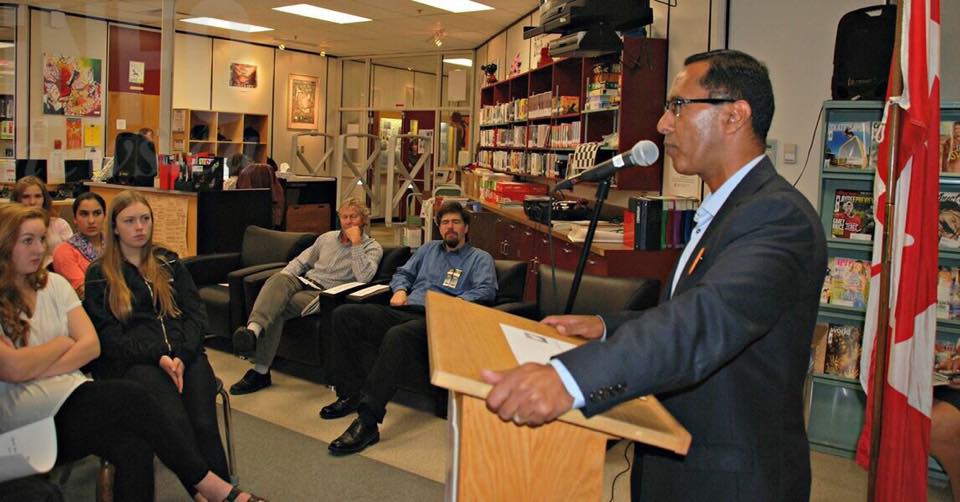 Three federal candidates — Green Matt Greenwood, New Democrat Bill Sundhu and Liberal Steve Powrie — attended the event and answered questions proposed by Grade 11 and 12 students yesterday, Sept. 28, in a hands-on civics lesson.