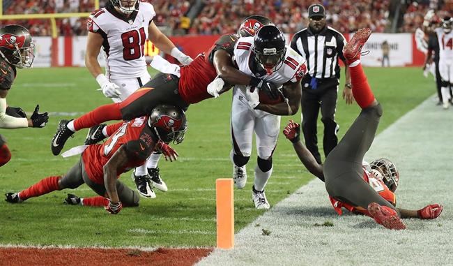 Jameis Winston threw for 299 yards and three TDs for the Bucs (4-10), including a 16-yarder to Adam Humphries that trimmed Atlanta’s lead to three points with 3:51 remaining.