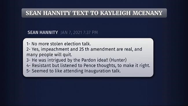 While Hannity was on the air, the Jan. 6 committee showed tweets that Hannity and other Fox News personalities had sent to Trump administration officials, warning that the Capitol riot was making the president look bad.