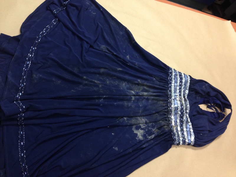 Bush describes the garment as a blue women’s halter-style dress that has a very distinctive beaded waist and additional beading along the hemline.