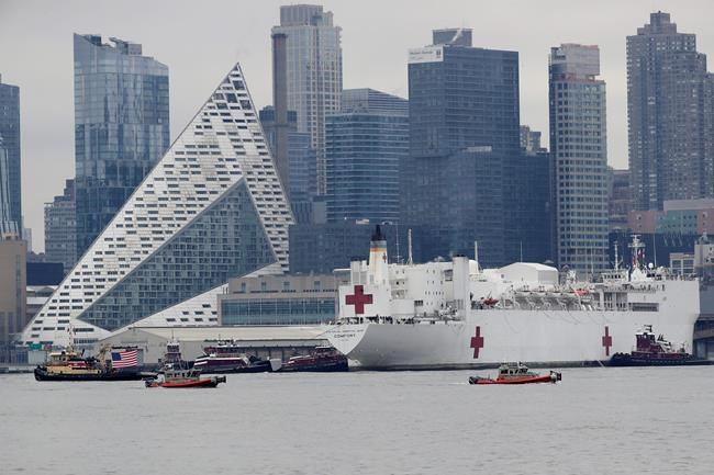 NEW YORK – A Navy hospital ship with 1,000 beds arrived Monday in New York City as the number of deaths in the state from the coronavirus outbreak climbed quickly. The disease continued to claim the lives of health care workers. Mayor Bill de Blasio said President Donald Trump’s suggestion that thousands of medical masks are disappearing from New York City hospitals is “insulting” to front-line medical workers.