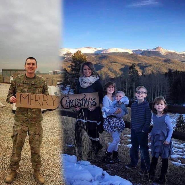 The photo of the couple and their four children combined pictures taken on two sides of the globe. Ashley had Brandon take a photo on base while holding a sign reading, “Merry” and combined it with a photo of her alongside their four children holding a sign that read “Christmas.”