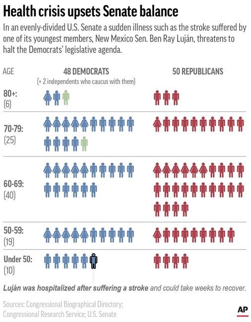 WASHINGTON (AP) — The Democrats’ fragile hold on the Senate majority became vividly apparent Wednesday with the sudden illnessof New Mexico Sen. Ben Ray Luján, who won’t be back to work for at least four weeks, throwing President Joe Biden’s Supreme Court pick and lagging legislative agenda in doubt.
