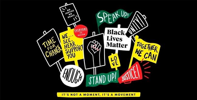 The T-shirt depicts protest signs with phrases including “Black Lives Matter,” “Speak Up” and “Time for Change.” One sign shows a raised black fist. “It’s not a moment, it’s a movement,” the shirt reads.