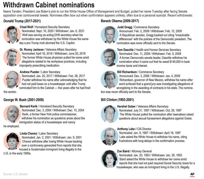 On Tuesday, Biden’s Cabinet was thrown into further uncertainty when his nominee to lead the White House budget office, Neera Tanden, withdrew from consideration after her nomination faced opposition from key senators on both sides of the aisle.