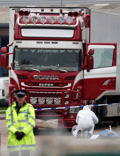 LONDON – The Latest on the death of 39 people found in a truck container in southeastern England (all times local):