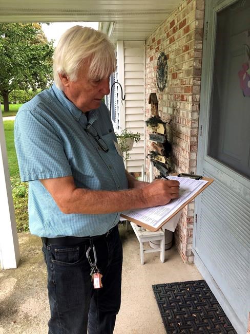 Tromping from yard to yard in the small town of Whitewater, he carries a clipboard listing persuadable voters in one hand and a stack of handouts listing 2020 election dates in the other. The 71-year-old looks up at a looming rain storm, and optimistically sums up his mission.