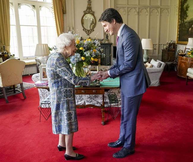 LONDON (AP) — Queen Elizabeth II met with Canadian Prime Minister Justin Trudeau on Monday, smiling and greeting him in front of a large bouquet of blue and yellow flowers, the colors of the Ukrainian flag.