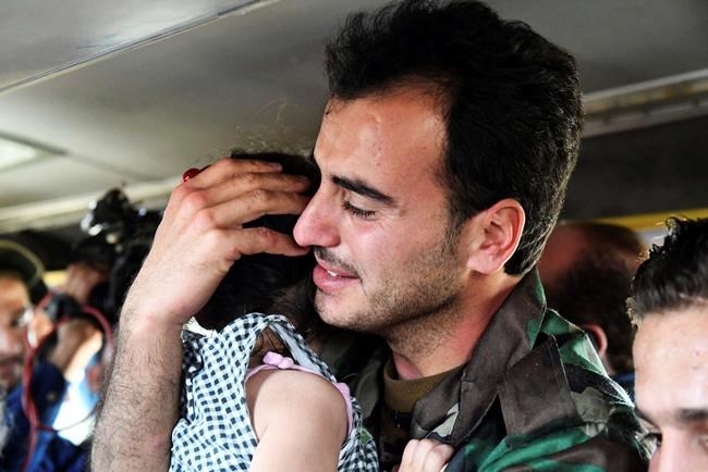 State-run Al-Ikhbariya TV broadcast images of the released men, women, children, who arrived by bus at a government-controlled checkpoint in Aleppo province. Many were in tears, and they could be seen kissing and hugging Syrian soldiers. The captives had been held by the insurgents in northern Syria since 2015.
