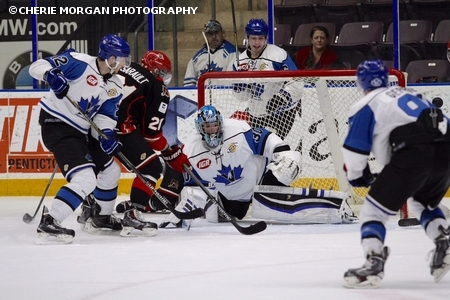 Then with under two-minutes left, Alberni Valley’s top-line manufactured an equalizer. Scott Clark dug the puck out of the corner and quickly fired a pass in the middle for Josh Adkins, who snapped the puck through Brodeur’s legs at 18:14.