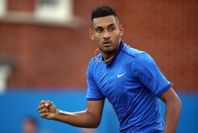 LONDON – Milos Raonic won the final set after an overnight break to beat Nick Kyrgios of Australia 6-7 (5), 6-4, 6-4 Wednesday at the grass-court Queen’s Club.