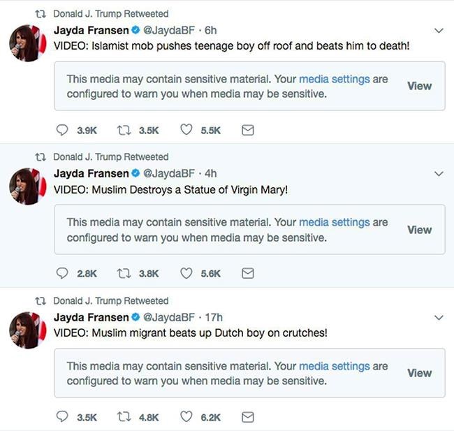 Trump drew sharp criticism from both government and opposition politicians in Britain after retweeting three videos from the account of deputy Britain First leader Jayda Fransen purporting to show violence by Muslims.