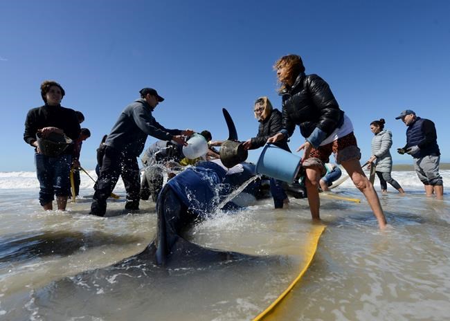A person spotted the orcas in the beach town of Mar Chiquita and called authorities early Monday. City workers, firefighters and marine biologists came to help and managed to pull six to safety.