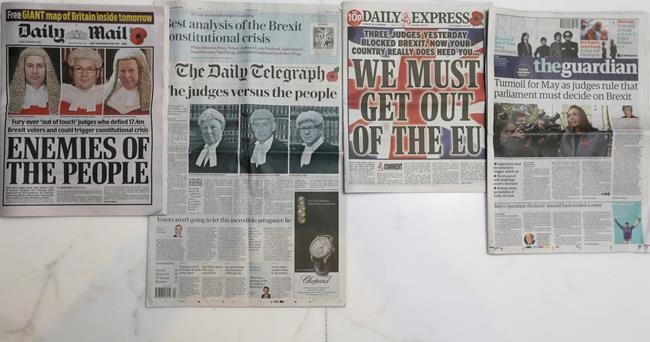 The Daily Telegraph headlined its front page: “The judges versus the people,” and carried a front-page column by U.K. Independence Party interim leader Nigel Farage saying the court ruling means that “a great betrayal is underway.”