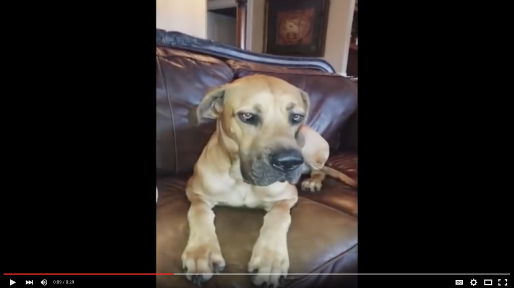 This dog's expression is priceless when his owner catches him with a stolen sandwich hidden away inside his mouth.
