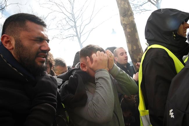 The violence started minutes after the protesters gathered Saturday, when they threw smoke bombs and other objects at officers along the Champs-Elysees — the scene of repeated past rioting — and started pounding on the windows of a police van.