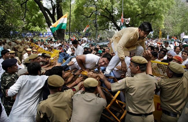 In this photo by Altaf Qadri, supporters of India’s opposition Congress party try to break through police barricades while marching toward the Indian Parliament during a protest against the ruling Bharatiya Janata Party government in New Delhi. Thousands of Congress supporters participated in a rally accusing the BJP government of political vendetta by levelling false corruption charges against Congress leaders, toppling elected state governments and muzzling the opposition’s voice. Those who spoke out against the current government included former Prime Minister Manmohan Singh, Congress Vice-President Rahul Gandhi and his mother, Congress leader Sonia Gandhi. She forecast the BJP government’s days were numbered.