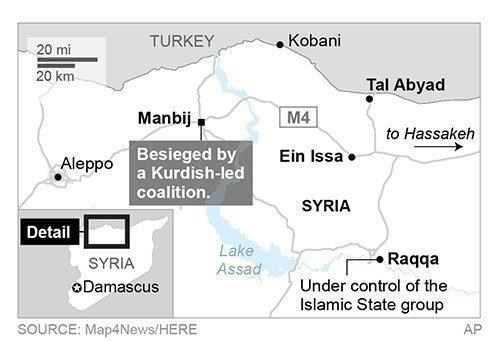 The coalition, backed by the U.S. and France, has been pressing an offensive since late May to try to capture the Islamic State stronghold, one of its largest in Aleppo province. Manbij is a waypoint on an IS supply line between Raqqa and the Turkish frontier.
