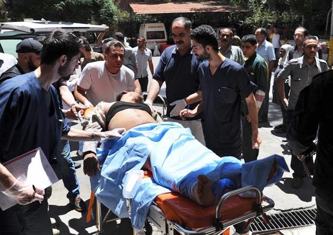 Syrian State TV said the blasts in the Sayyida Zeinab area just south of Damascus killed 12 people and wounded 55 others. The Britain-based Syrian Observatory for Human Rights said 20 people were killed and dozens were wounded in the two explosions.