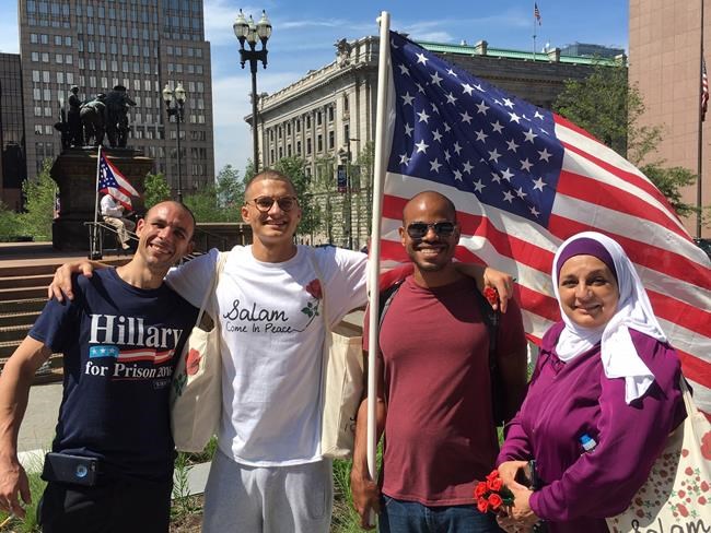 A former military man in a “Hillary For Prison” T-shirt waved a U.S. flag. He paused as a Muslim woman in a hijab walked by with her son, handing out pens with roses they’d made inscribed with the message, “Salam Means Peace.”