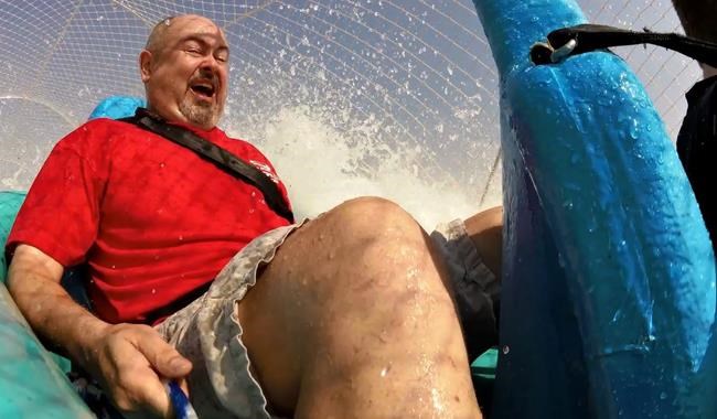 On the 2-year-old waterslide certified by Guinness World Records as the world’s tallest, riders sit in multi-person rafts that begin with the steep drop, followed by a surge up a second hill before a 50-foot descent to a finishing pool. Along the way, riders clutch ropes along the inside of the raft.