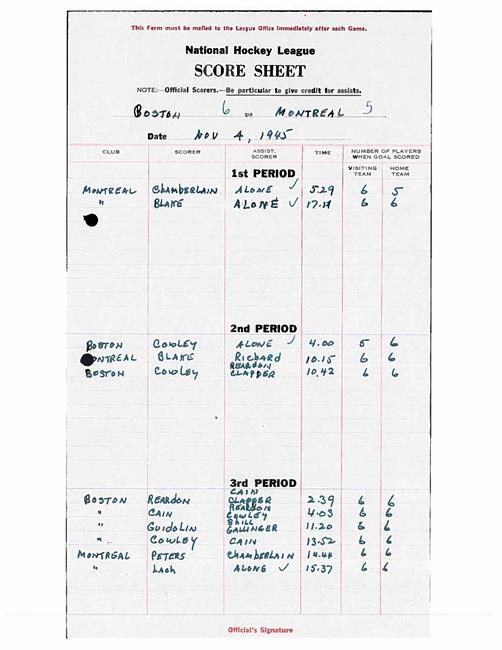 Among the finds was an assist on a Toe Blake goal at 10:15 of the second period of a 6-5 Boston Bruins victory over Montreal on Nov. 4, 1945, during a time when the Punch Line of Richard, Blake and Elmer Lach was terrorizing the league.