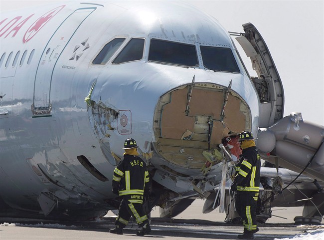 The aircraft was flying from Toronto when it hit an antenna array, slammed into the ground about 335 metres short of the runway and then skidded for another 335 metres before stopping.