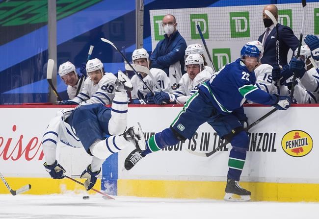 The collision happened 10 minutes into the second period of Vancouver’s 3-2 overtime win Sunday when Edler took out Hyman right in front of the Leafs bench.