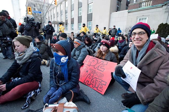 TORONTO – Hundreds of people gathered outside a shut-down U.S. consulate in Toronto and elsewhere in Canada on Monday to denounce the American entry ban on people from seven predominantly Muslim countries, and to urge action from the Liberal government.