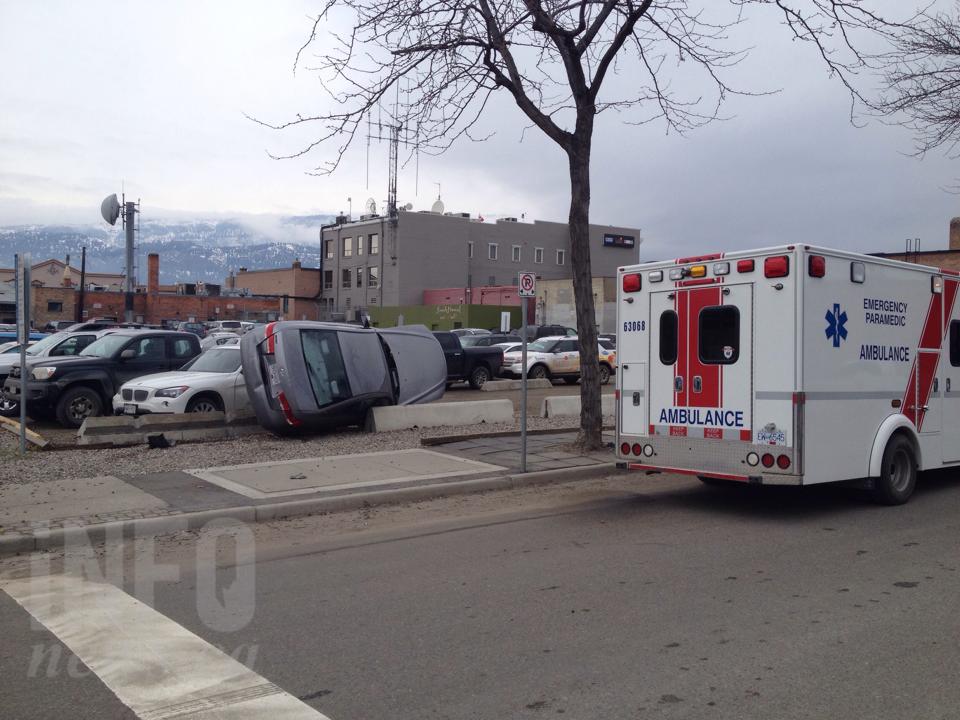 KELOWNA – A middle-aged woman was taken to hospital after her car was rear ended and pushed on it’s side in a downtown parking lot this morning.