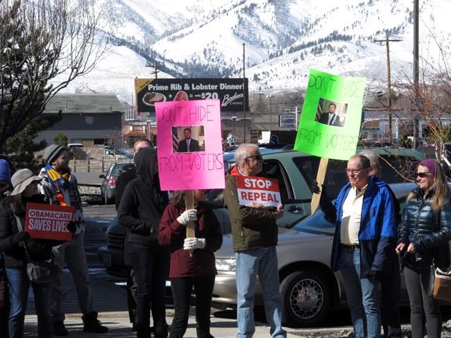About 200 protesters clamoured Wednesday outside a Carson City, Nevada, casino where Sen. Dean Heller and Rep. Mark Amodei, both Republicans, spoke behind closed doors in a session for business leaders — and ended getting booed and heckled inside the private luncheon.