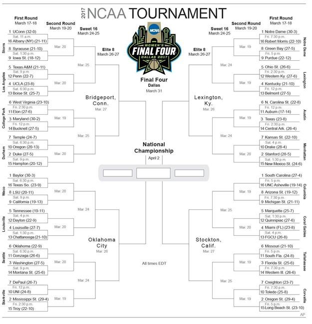 All four hope to get to Dallas for the Final Four on Friday, March 31. The NCAA switched the national semifinals back to a Friday-Sunday format this season for the first time since 2002. The Huskies would matchup with Baylor while South Carolina and Notre Dame would play if all four teams advance that far. The Lady Bears are hoping to make the short drive from Waco to Dallas.