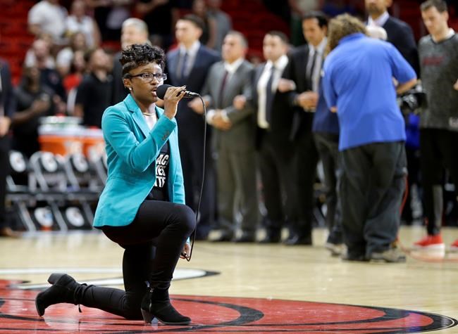MIAMI – A woman performing the national anthem prior to an NBA preseason game in Miami did so while kneeling at midcourt.