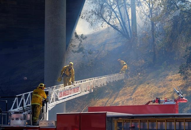 Los Angeles firefighters say they have contained a brush fire that threatened homes in a densely populated neighbourhood along a freeway.