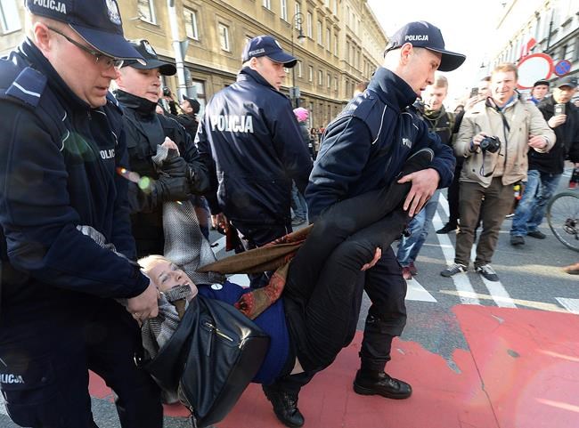 WARSAW, Poland – Police in Poland used force Saturday to remove a few dozen protesters who tried to block a march in downtown Warsaw by a nationalist organization celebrating its anniversary.